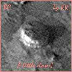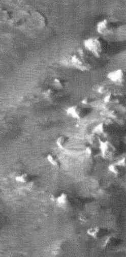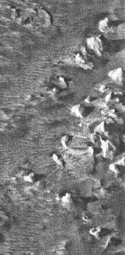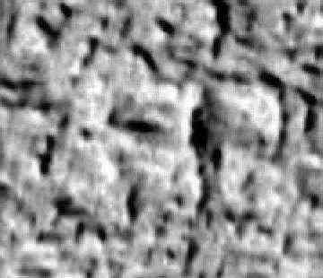 10. ábra. A MOC #04205 sorozatszámú eredeti felvétel az egyik marsi városról. 11. ábra. A MOC #04205 felvétel kontrasztosított változata. Ahogyan az előző felvételt, úgy a következőt is elfelejtették átpixelezni. Így egy újabb marsi várost vehetünk alapos elemzés alá. A kép szintén az MGS jóvoltából jutott el hozzánk, 1999. április 30-án készült, s a Mars déli szélesség 5.95 és keleti hosszúság 72.53 fokánál található területet mutatja 4.79 méteres képpontonkénti felbontással. A felvétel sorozatszáma: MOC #04205 (10 ábra). Holger Isenberg bukkant rá a Marsról érkező felvételek tanulmányozása során. A képen egyértelműen épületek láthatók, szélességük 40 és 200 méter közötti, magasságuk pedig 10 és 100 méter közé esik. Meglehetősen furcsa geológiai eseményeknek kellett volna a Marson bekövetkeznie ahhoz, hogy ilyesfajta épületek megszülethessenek!
