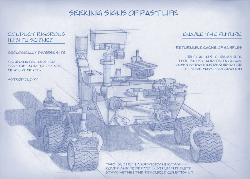 4. ábra. 2020-ban tervezi a NASA indítani legújabb marsjáróját. Egyelőre még csak vázlat szintjén létezik. Alapkiépítése megfelel a jelenleg is a Marson dolgozó Curiosity marsjárónak. Műszerezettsége tér el csupán.