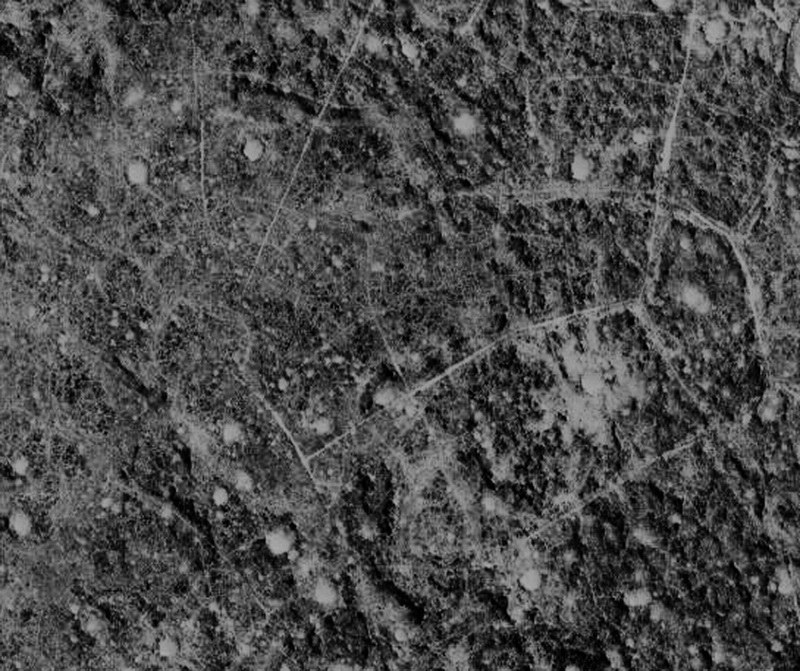 2. ábra. Mintha szétbombázott települést látnánk – ugyancsak a Marson. Első ránézésre igen szabályos „utcahálózatot” láthatunk, s ha nem tudnánk, hogy ez a felvétel a Marsról készült, senki, egy másodpercig sem vitatná ezt a kijelentésünket. Ám mivel a fotó bolygószomszédunk felszínét ábrázolja, a szokásos NASA-magyarázatokba ütközünk. Már ha egyáltalán szóra méltatják a kérdéses felvételt. Persze éppen oda lehet figyelni a leginkább hihető „megroskadt terület” magyarázatra, ám ez esetben sincs semmiféle magyarázat a számos fő- és alárendelt derékszöget mutató hálózat-rendszerre. Meglehetősen érdekes a terület erős kráterezettsége. A Marson ritkaságszámba megy ilyen kis területen ilyen nagy mennyiségű kráter jelenléte. Méretük nagyjából két tartományba esik, vannak közöttük kisebbek és nagyobbak is. Számomra úgy tűnik, mintha ezt a marsi települést(?) egész egyszerűen szétbombázták volna. Ha a II. Világháború hasonló harci eseményeinek „eredményeit” vizsgáljuk, a hasonlóság szembetűnő lesz. Természetesen e felvetésre, és más jellegűek esetében csak akkor tudnánk alátámasztást vagy cáfolatot szerezni, ha nagyfelbontású, színes és eredeti marsi felvételeket láthatnánk. De ez a kívánságunk bizonyára még nagyon hosszú időn át az álmok kategóriájába fog tartozni…