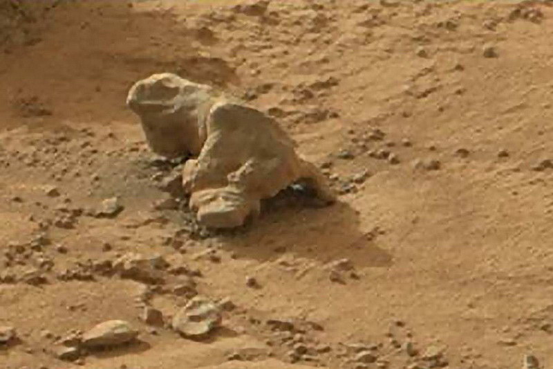 Gyíkkövület vagy –szobor a Marson? Bolygószomszédunk felszínén a különböző marsrobotok által készített képeken számos kövület látható. A szóban forgó felvétel Sol 153-kor készült, ugyancsak a Curiosity részétől. (Természetesen, ahogy lenni szokott, már amikor a NASA szakemberei egyáltalán szóra méltatják a kérdezőt, semmi másról nincs szó, mint „szélfútta szikláról”, a „természet játékáról”, stb. Egy-egy esetben még csak-csak elmegy ez az értelmezés, de amikor százával kerülnek elő felismerhető és szabályos „szélfútta sziklák”, akkor már minimum kételkedni illik az efféle magyarázatokban) Első ránézésre a forma adja magát, ám eredetére vonatkozóan már korántsem ennyire egyértelmű a helyzet. Nyaklebernyeges gyíkalkatú állatot láthatunk, a szája a szemredője, a hátsó lábának részletei egészen jól kivehetők. Ám az is, hogy az első és a hátsó lába valahogy furcsán áll egymáshoz képest. Mintha valami történt volna vele, s emiatt húzná a bal első lábát. A lábfeje is meglehetősen szokatlan, inkább a szilárd talajon való mozgásra utal, mint mocsáros, ingoványos területre.