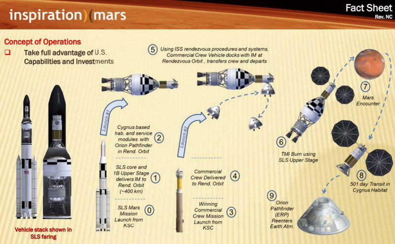 A küldetés körüli bizonytalanságok ellenére egyre több híres kutató és űrhajós csatlakozik a törekvéshez, és támogatják azt minden erejükkel és lehetőségükkel. Sokkal nagyobb mértékben, mint azt maga az Inspiration Mars szervezet előre várta volna. A Holdon járt űrhajósok mellett megszólalt a témában Taber MacCallum is, aki a Paragon űrvállalkozás társalapítója, ezt a céget kérték fel az életfenntartó-rendszer kifejlesztésére: „Érdekes látni a nemzetközi hozzáállást. Amikor ennek az egésznek nekifogtunk, Amerika számára terveztük a küldetést. Komoly okunk van rá, hogy ezt a nézetet megváltoztassuk, és sokkal inkább az egész Föld nevében végrehajtandó missziónak tekintsük – amerikai irányítás alatt.” Természetesen már az indulás részleteit is kidolgozták. Az út 501 napos tartama egyben rekord-idejű űrrepülés is lesz. A startra 2018. január 5-én kerül sor. Ezt a Marsig vezető 228 napos szakasz követi, a bolygó éjszakai (vajon miért?) oldala feletti elrepülésre 2018. Augusztus 21-én kerül sor. A Marsot megkerülve a Naprendszer belseje felé indulnak az űrhajósok, egészen a Vénusz pályájáig haladnak befelé, majd a Földnek veszik az irányt, ahová a Mars melletti elhaladást követően 273 nappal érnek. És bíznak a szerencsés leszállásban… (Érdekesség, hogy az 1962-es, nem hivatalos egyutas Mars-repülés esetében a sorrend fordított volt, a Vénusz felé indulva célozták meg a Marsot.) Csak remélhetjük, hogy minden gáncsoskodás és kételkedés ellenére ez a csodálatos terv megvalósulhat, és végre az ember kiléphet a „bölcsőből”.