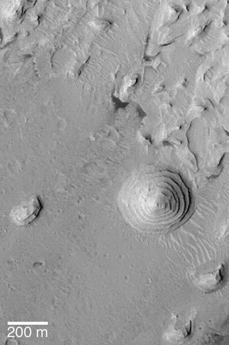 méter átmérőjű 200 méter magas alkotása mellett. A marsi képződmény egy kráter alján található. Valóban, a krátert kitölthette víz, és bizonyára ki is töltötte. Ám annak kivitelezése, hogy a víz mindig ugyanannyit apad, és ugyanannyi ideig marad ugyanazon a szinten 7-szer egymást után, hogy a lépcsős szerkezet létrejöhessen, az kizárt, még ha magyarázatnak roppant tetszetős is lenne. Elő szokták még venni a periodikusan olvadó gleccsereket is, persze, fantáziálni lehet, de mutatni kellene egy párhuzamos példát, amikor bizonyítható a gleccserek ilyen jellegű hatása, az viszont nincs. Ahogy Cuicuilco piramisa kapcsán is hatalmas butaságokat beszélnek, ugyanis a körpiramis korát 2000 évben adják meg, miközben a körpiramis egy részét befedő láva legalább 8 000 éves…, úgy a Mars esetében is találkozhatunk hajmeresztő „magyarázatokkal”, s főleg csak azokkal. A helyzet nem reménytelen, ugyanis: