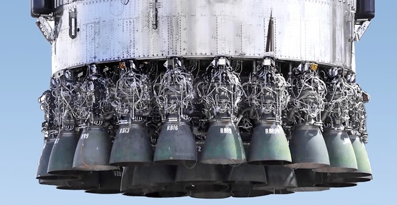 egyszerre beindítják a 33 Raptor-hajtóművet, melyek szinkron-működésének