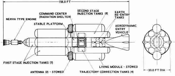 Komplett amerikai marsűrhajó. Látható a NERVA fokozat és a háromszög alakú marsraszálló-egység.