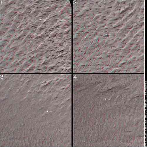 Katonai technikával kivitelezett képfeldolgozás a Mars Polar Landerről. Sztereo-szemüveggel jól látható az űrszonda jellegzetes kettős napelemszárnya.