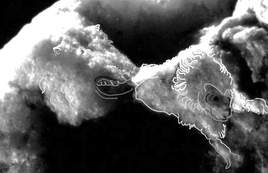Részlet. A kép az energia, a robbanóanyagok és az emberek viszonyáról szól. Ezen a részleten egy majom menekül a medve szájából. A szimbolikus ábrázolás értelme: az erő foglyul ejti az okosságot, mondhatnánk, "rossz kapitány rabja lett a jó".