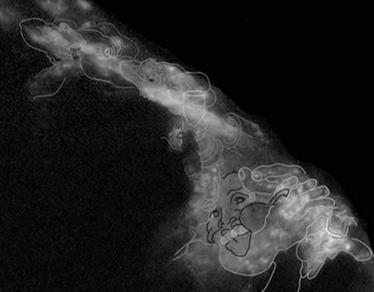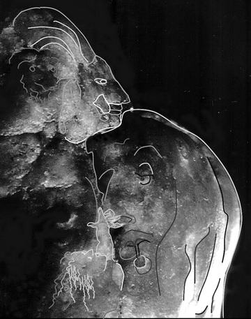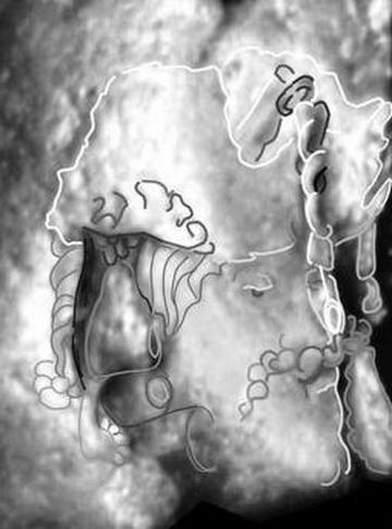 A kép egy 20 x 14 mm-es részlete. a kép rekonstrukciója évekig tartott. A férfi két markában hemzsegnek a szexuális megnyilvánulásokat szimbolizáló figurák, emberek és állatok. A férfi fején mosolygó kígyó terpeszkedik, farka hegye szinte gúnyolódva mutat a férfi önfeledt arcára.