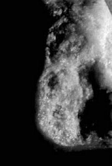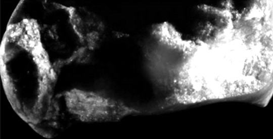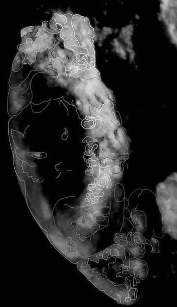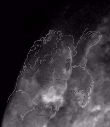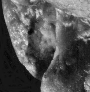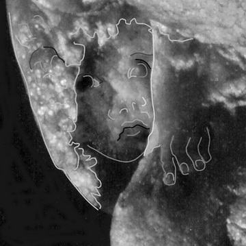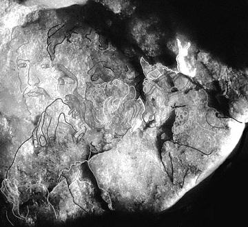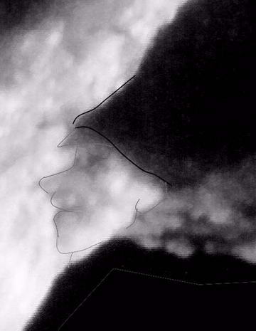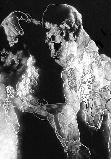 Részlet. Valós nagysága 8 x 4 mm. a fiatalember kissé részvétlenül és megelégedve szemléli a képen látható borzalmat: két férfi küzd, az egyik darabokra tépi a másik arcát. magyarázatul az árnykép rejtett része szolgál: az öncélúan művel szex így semmisíti meg az ember egy.éniségét.