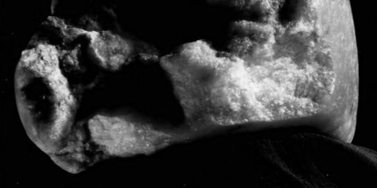 Részlet. A fiatal arcról rémület sugárzik. ha jobban szemügyre vesszük, akkor látható, hogy arcának egyik fele csontos koponya-részletekből áll. jobb és bal keze is sérült, homlokába kődarab fúródott. a halál hírének szimbolikus alakja.