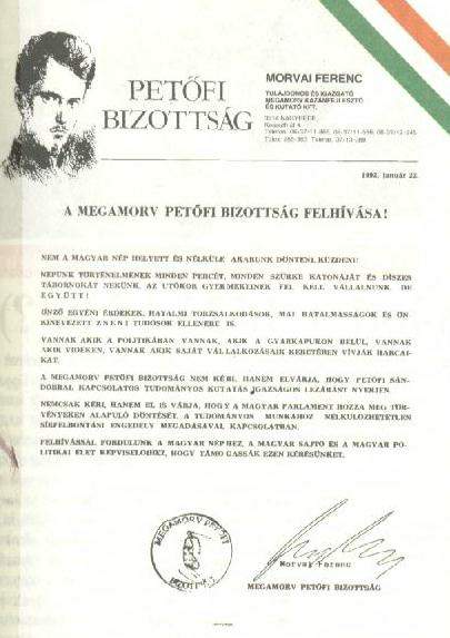 - Az elmúlt évek tapasztalatai azt mutatják, hogy tiszta eszközökkel, törvényes úton nem tudjuk befejezni a kutatást. Közben tájékoztattak, hogy a sírbontási engedély megadása nem főpolgármesteri hatáskör, hanem a kerületi tisztiorvoshoz tartozik. Én azonban már ebben sem reménykedem. Ezért 100 ezer aláírást gyűjtünk össze, amit a Partementhez kívánunk benyújtani. Igazán persze a Parlamentben sem reménykedem. Bár március 15-ére már nemigen tudunk felkészülni, de ha minden kötél szakad az utcára is kimegyünk tüntetni. S Petőfi ügyét a gazdasági problémákkal lesz szükséges összekapcsolni, amit nem szívesen teszek meg. De valószínűleg az elfásult magyar polgárok csak Petőfi miatt nemigen mennek ki az utcára. A tüntetésnek beláthatatlan következményei vannak, garantálom, hogy törvényes és demokratikus úton fog kezdődni a tüntetés, de hogy úgy is végződik majd, abban már nem vagyok biztos. Petőfi Sándor csinált már bonyodalmakat ebben az országban...