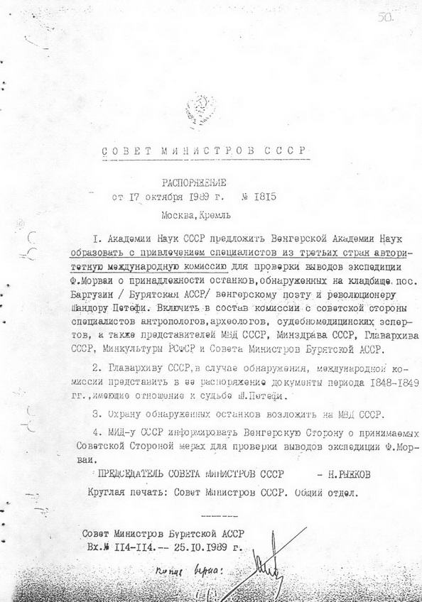 1. A Szovjetunió tudományos Akadémiája tegyen javaslatot a Magyar Tudományos Akadémiának, ogy az a Morvai F. expedíciója által Barguzin falu (Burját SzSzK) temetőjében megtalált maradványok, s az expedíció megállapításai, amelyek szerint Petőfi Sándor magyar költő és forradalmár hamvait találták meg, ellenőrzése céljából harmadik országok szakembereinek bevonásával állítson össze tekintélyes nemzetközi bizottságot. Szovjet részről a bizottságban vegyenek részt antropológusok, régészek, törvényszéki szakértők, valamint a Szovjetunió Belügyminisztériumának, Egészségügyi Minisztériumának, a Központi Levéltárának, a Szövetségi Orosz Köztársaság Kulturális Minisztériumának és a Burját SzSzK képviselői. 2. A Szovjetunió Központi Levéltára, azok megtalálása esetén, Petőfi Sándor sorsával kapcsolatos 1848-1849 időszaknak dokumentumait bocsássa a nemzetközi bizottság rendelkezésére. 3. A Szovjetunió Belügyminisztériuma biztosítsa a feltárt maradványok őrzését. 4. A Szovjetunió Külügyminisztériuma tájékoztassa a Magyar Felet a Morvai F. expedíciója megállapításainak ellenőrzése érdekébe a Szovjet Fél által megtett intézkedésekről.