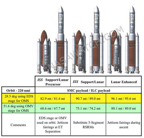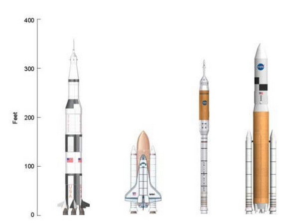 A leállított Ares-rendszer A rendszer maga két különböző méretű hordozórakétát jelent, a kisebb az Ares-I, ennek hivatott az új, Orion nevet viselő űrhajót földkörüli pályára juttatni, míg az Ares-V (utalván a Saturn-V űrhajó nevére) lesz majd képes igazán nagy terhek orbitális pályára küldésére, beleértve a holdrepülés utolsó fokozatát, s magát a holdkompot is. Az Ares-I lényegében megkapja az űrrepülőgépek egyik szilárd gyorsító-fokozatát, a négy szegmens helyet ötöt tartalmaz majd, a hossza így megnövekedik, nyilván a tolóereje is, ám a rendszert rendkívül instabillá teszi ez a felépítés. Az első fokozat a kiégése után leválik, ejtőernyői segítségével tér vissza, begyűjtése után szétszedik átvizsgálják, a legkisebb szegecséig, utána ismét összerakják, feltöltik és ismételten felhasználják. Azaz az egyszer már egymás mellett szerepelt elemek legközelebb egész máshova is kerülhetnek, tovább csökkentve a megbízhatóságot. A második fokozat folyékony hajtóanyagú hajtóműve a J-X2 nem más, mint a Saturn-I és a Saturn-V J-2-es hajtóművének továbbfejlesztése, azaz közel 50 éves technika. A második fokozat műanyaghab-borításán sem kívánnak változtatni, pontosan ugyanaz melyet az űrrepülőgép-rendszerben ma is alkalmaznak, s hol a harkályok rágják meg, hol egyéb gondok vannak vele, egy azonban szinte minden alkalommal jelentkezik, ez pedig darabjainak a start közbeni folyamatos leválása, ez a hiányossága – a hivatalos változat szerint – okozta a Columbia űrrepülőgép pusztulását, de számos alkalommal került az űrrepülőgép ezen kívül is katasztrófa-közeli helyzetbe. Tovább erőltetik tehát a kifejezetten megbízhatatlan és veszélyes megoldás alkalmazását, abból a megfontolásból, hogy ha le is válik, nincs amiben kárt okozna… A 2. fokozat tetején egy irányító-gyűrű kap helyet, ide építik bele a rakéta irányító-rendszereit, ezek kísérik majd figyelemmel a repülés közben a pályát, s ha pedig szükségessé válik, akkor beavatkoznak. A rakéta csúcsán helyezkedik el az Orion űrhajó, vagy pedig a legfeljebb 25 tonnányi hasznos teher. Az Orion esetében még egy mentőtorony is helyet kap, tehát visszatérnek az 50 évvel ezelőtti megoldáshoz, az oroszok által azóta is folyamatosan – a Szojuz űrhajókon - alkalmazott és jól bevált mentési módszerhez. A mentőtorony a kilövés során bekövetkező hiba esetén mintegy letépi a parancsnoki modult, ahol a személyzet is helyet foglal, s biztonságos távolságra juttatja a hordozórakétától, majd ejtőernyővel ereszkedik alá. A jóval testesebb Ares-V hivatott a nehezebb terhek világűrbe szállításáért, tőle várják a tervasztalokon létező holdbázis elemeinek feljuttatását, előtte pedig természetesen az Orion űrhajó Hold felé vezető pályára állítását a Holdra leszálló egység, az Altair holdkomp kíséretében. Emellett – a korábbiakhoz képest – hatalmas tömegű űrszondákat, műszereket is indíthat, akár űrteleszkópot, űrállomás-elemeket, de akár űrgyárak, űr-erőművek alkotóit is. Űrbe jutását két szilárd gyorsító-fokozat segíti, ezek az Ares-I-hez tervezetteknél is hosszabbak lennének, öt és fél szegmensből állnának. A második fokozatának tekintetében még nyitott a tervezés, a jelenlegi állapot szerint hat darab RS-68 jelű folyékony hajtóanyagú rakéta hajtaná meg, ugyancsak nem új fejlesztés, hiszen húsz éves eszközről van szó. A harmadik fokozat az Ares-I-hez hasonlatosan egyetlen J-2X hajtóművet használ majd. Az óriásrakéta közel 150 tonna terhet képes alacsony földkörüli pályára állítani, illetve 71 tonnát a Hold köré. Paraméterei tehát meghaladják a Saturn-V rakétáét, legalábbis elméletben Az Ares rakéta-család fejlesztése korántsem halad zökkenőmentesen, az Ares-I első fokozata esetében ugyanis nem várt rezgéseket tapasztaltak, később a teljesítménnyel kapcsolatban is gondok jelentkeztek, emiatt a teljes űrhajót át kellett tervezni, azon spórolni a tömeggel, ahol csak tudtak, ahelyett, hogy a rakéta teljesítményét növelték volna, sokkal kevesebb pénzt elpazarolva. Ráadásul egyre távolabb kerül az egész tervezet attól az alapkoncepciótól, miszerint az űrrepülőgép-rendszer minél több elemét felhasználják, azaz éppen a kezdeti célkitűzést nem sikerül megvalósítani, miközben a költségek hihetetlen mértéket öltenek a – nagyrészt – semmiért. Az Ares-I első fokozatának tesztindítása 2009. második felére csúszott, október 28-ra, mivel az indításhoz használni kívánt tornyot, a 39B jelűt még az űrrepülőgépek használják. A legoptimistább tervek szerint az Orion űrhajó leghamarabb 2015-ben startolhatott volna, személyzettel majd csak egy évvel ezt követően, az Ares-V még sokkal később, talán 2020-ban. Barack Obama elnök szerint továbbra is igen fontos, hogy a NASA kifejlessze a maga óriás-hordozórakétáját, mivel Constellation-Program törlésre került, vele az Ares-V, így még elképzelés sincs arról, hogy ez a bizonyos óriás-rakéta miként nézzen ki, mekkora teherbírása, legyen, stb.