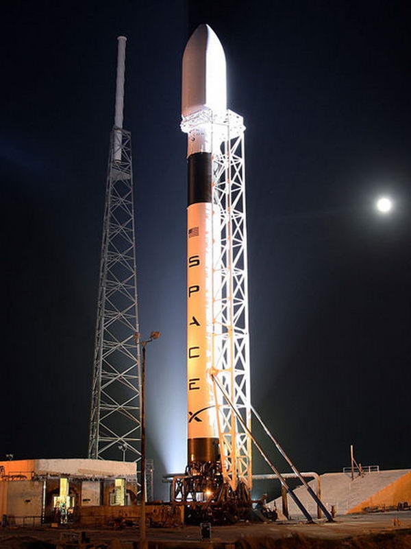 18. ábra. A SpaceX Falcon-9 (Dragon) nevű űrhajója a kilövőállásban. A NASA Orion űrhajójánál akár sokkal többre is képes lehet, amellett, hogy töredékébe kerül. A SpaceX (Space Exploration Technologies – Űrkutatási Technológiák) nevet viselő vállalat fejlesztette ki és építette meg a Falcon-1-et, a világ első, teljes egészében magánfinanszírozású hordozórakétáját. A kétfokozatú, részlegesen újrafelhasználható űreszköz kifejlesztésével a 2000-es évek első évtizedének második felében készültek el. Az első fokozat többször felhasználható, az óceánba ejtőernyővel tér vissza. Meghajtásáról a Merlin-1C rakétamotor gondoskodik. A 2. fokozatot a Kestrel hajtómű gyorsítja. A hasznos tehet pályára juttatása kg-onként kevesebbe kerül 20.000 dollárnál a Falcon-1 típusnál. A továbbfejlesztett Falcon-1E változat esetében ez a költség már csak 9.000 dollár lesz. A rakéta első három startja 2006. március 24., 2007. március 21., és 2008. augusztus 3 - sikertelen volt. Nyilvánvalóan hatalmas nyomás nehezedett a cégre, hiszen szerették volna úgy beállítani, mintha egy magánvállalkozás képtelen lenne megbirkózni ilyen szintű feladattal, amire ugye a NASA is oly gyakran képtelen volt…