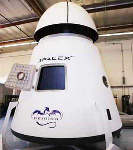 19. ábra. A SpaceX Dragon űrhajója. A további indítások már sikeresnek bizonyultak, s a kísérlet-sorozat eredményeképpen a kezdeti változatot kivonják a forgalomból, 2010-től váltja fel, a 450 kg-mal szemben már 900 kg-ot alacsony földkörüli pályára állítani képes Falcon-1E. A Falcon-9 már egy jóval erősebb változat, újra-felhasználható, kétfokozatú hordozórakéta. Sokféle összeállítást dolgoztak ki, ezek teherbíró-képessége 10.450 kg és 26.610 kg között mozog alacsony földkörüli pályára és 4.540 kg, illetve 15.010 kg között geoszinkron pályára. 2010. február 23-án az első Falcon-9-es hordozórakétát indító-állásba emelték a Canaveral-fokon, a 40-es számú indítóállásba, itt várja az áprilisra tervezett felbocsátását. 2010-re még két további indítást terveznek, a második repülés alkalmával már a Nemzetközi Űrállomást is megközelítenék, a harmadik út során pedig már össze is kapcsolódnának azzal. Ha minden a tervek szerint történik, néhány éven belül már embereket is szállíthat, mindenesetre néhány űrhajóst már ki is képeztek a vele való repülésre. A Falcon-9 hordozórakéta szállítja tehát a Dragon űrhajót, pilótás, illetőleg teher-változatát. A SpaceX vállalat szerződésben áll a NASA-val, több milliárd dollárt kaptak a fejlesztésre, és további dollár milliárdok kerülhetnek átutalásra a cég számlájára, ha minden rendben zajlik. A cég jól megfontol érdeke is, hogy így legyen. Számos további vállalat tervez, illetve épít különböző kategóriájú űrhajókat, illetve szuborbitális eszközöket űrturisták számára. Ezekhez a kirándulásokhoz már a megfelelő űrrepülőterek is megépültek, építés alatt állnak. A Bigelow vállalat már egész felfújható űrállomás építésének tervével foglalkozik, illetve kisebb egységei már próbaútjukat teljesítik, a cél, űrhotel építése néhány éven belül, elsősorban nászutas párok számára. A fejlesztésekbe a Boeing is betársult. A lehetőség tehát adott, a technika adott, vagy pedig fejlesztés alatt áll, ugyancsak politikai döntést igényel a továbblépés, emellett persze fontos kérdés, a katonaság mit szól hozzá, hogy civilek árasszák el a világűrt. Félő, hogy ez a fajta törekvés erős ellenállásukba ütközik majd…
