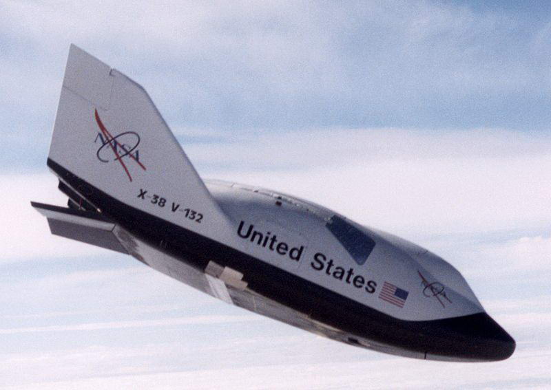 5. ábra. Az X-38-as CRV (Személyzet Visszaszállító Jármű) egyik sikeres próbája során. Habár az űreszköz szinte teljes egészében elkészült és kipróbálták, használatától a NASA mégis eltekintett.