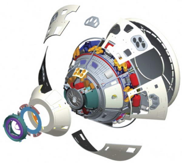 A meghiúsult Orion űrhajó Mint említettük, az Orion űrhajó alap-elképzelése teljességgel azonos az 1960-as évek elején kifejlesztett Apolló űrhajóval. Két fő egységből áll, a csonka kúp alakú Parancsnoki Modulból (CM – Command Module) és a hengeres felépítésű Műszaki Modulból (SM, Service Module), teljes tömege előreláthatóan 20.5 tonna.