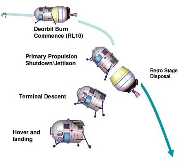 13. ábra. Alternatív holdraszállási megoldások a Lockheed részéről. Az Altair-Orion rendszert a Föld vonzáskörzetéből az EDS (Earth Departure State – Föld-elhagyó Fokozat) rakéta juttatja a Hold felé vezető pályára, pontosan ugyanazt a szerepet betöltve, mint a Saturn hordozórakéta esetén a Saturn IV-B fokozat. Az EDS-t és az Altairt egy Ares-V rakéta csúcsára építve bocsátják fel, majd a második fokozat leválását követően saját JX-2-es hajtóművével Föld körüli pályára áll, és itt várja majd az Ares-I-gyel indított Orion űrhajót. Az Orion hozzákapcsolódik majd az EDS-Altair rendszerhez, majd az EDS begyújtja a hajtóműveit és a komplexum rááll a Hold felé vezető pályára, elegendő sebességre gyorsítva az Orion űrhajót és az Altair holdkompot, majd leválik.