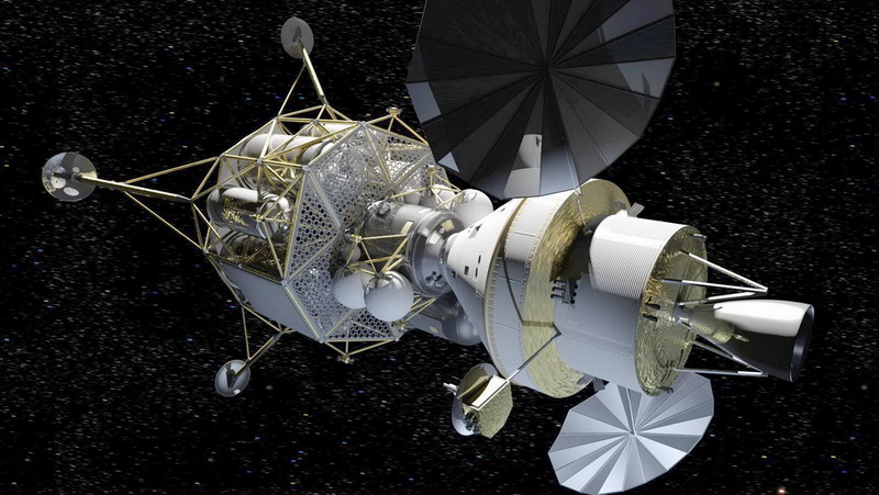 12. ábra. Az Altair holdkomp. A Holdkompot négy darab RL-10-es hajtómű fékezi és juttatja a felszínre, de a Leszálló Egységben kap helyet az üzemanyagon kívül a Hold felszínére juttatni kívánt hasznos teher is. A másik fő alkotó a Lakó-visszatérő Egység, ezen azonban már csak egyetlen RL-10-es hajtómű található. A régivel ellentétben, az új elképzelések szerint a legénység valamennyi tagja leszáll a Hold felszínére, azaz – várhatóan – mind a négy fő, nem marad fent pilóta a Hold körüli pályán keringve, az Orion űrhajó üresen várja majd érkezésüket, a legénység visszatérését. Az űrhajósok egy egész hetet tudnak a Hold felszínén tölteni, a későbbiekben viszont, esetleges holdbázis kiépítésekor, a Holdkomp több hónapig, de akár fél évig terjedően is működhet. A Lockheed terveiben a Lakóegység külön zsilipet kapna, így az űrhajósok nem hordanák be a holdport a Lakóegységbe. Az Apolló-program során a teljes Holdkomp szolgált zsilipként, a Hold felszínére lépéskor kiszivattyúzták belőle a levegőt, s amikor a külső munka elvégzése után visszatértek, s az ajtót bezárták, akkor töltötték fel újra levegővel, s vetették le az űrhajósok a szkafanderüket. Az így behordott holdpor viszont sok kellemetlenséget okozott. Az Altair fedélzeti irányító-rendszere pontosan olyan, mint az Orioné, azaz használata is teljességgel megegyező alapképzést igényel.