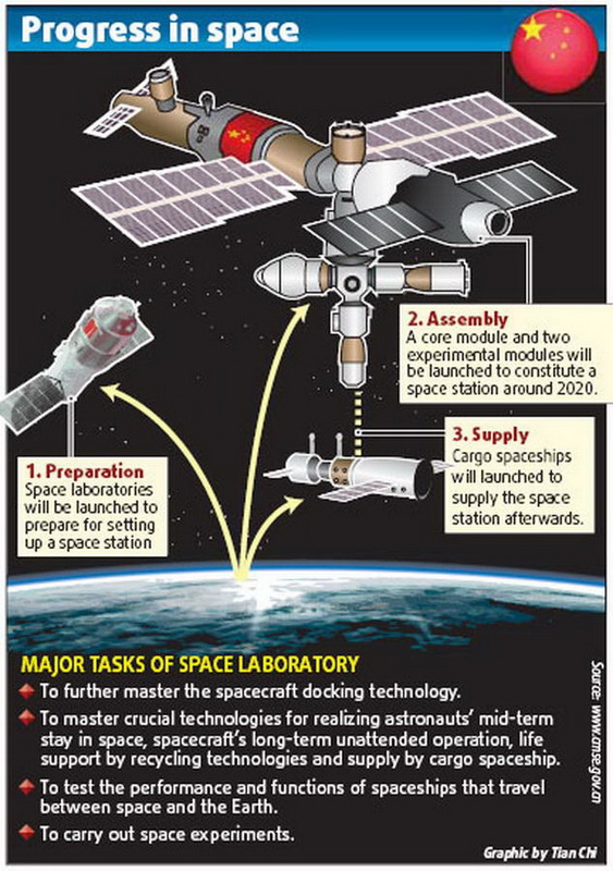 Kínai űrállomás A Szencsu-7 visszatérését követően a kínai hírügynökségek bejelentették, az ország pilótás űrrepülésének történetét űrállomáson végzendő munkával kívánják folytatni. A fejlesztések már akkoriban is folytak, többféle megoldás is napvilágot látott, míg végül tisztázódott a dátum is, eszerint 2011. tavaszán szeretné Kína felbocsátani első, 8.5 tonnás, önálló űrállomását, a Tiangong-1-et (Mennyei Palota). 2009. Január 25-én, a kínai holdújév kezdetére rendezett ünnepség keretében be is mutatták modelljét. A Szencsu-8 űrhajó még ugyanabban az évben, pilóták nélkül, automatikus módban dokkolna az űrállomáshoz, mely lényegében nem más, mint egy kissé átalakított Szencsu űrhajó, annak Orbitális Egységéből és meghosszabbított Műszaki Egységéből áll majd. Élettartamát két évesre tervezik. Amennyiben a személyzet nélküli próbák sikeresen lezajlanak, két újabb űrhajó kapcsolódik majd az űrállomáshoz egymást követve, a Szencsu-9 és a Szencsu-10. Az űrhajók már 2-3 fős személyzettel szállnak fel, talán az első kínai női űrhajós is köztük lesz. A repülések maximális hossza néhány hét lehet.