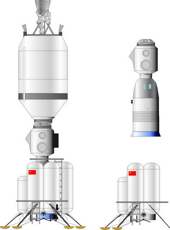 30. ábra. Változatok a Sencsu űrhajóra alapozott kínai holdraszálló-egységekre. A Csang’e-4 holdszonda 2017-ben startolhat, fő feladata holdi kőzetek visszaszállítása a Földre. A kísérletnek elsődleges célja nyilvánvalóan nemcsak holdkőzetek Földre szállítása, hanem ezzel együtt a Holdról való felszállás, a Föld közelébe való visszatérés és leszállás igen összetett műveletsorozatának pontos végrehajtása, azaz a pilótás holdrepülések előkészítése. Az évszámok sűrűn változnak, a reális dátum az első kínai űrhajós holdraszállására valamikor 2025. és 2030. között tűnik megvalósíthatónak, ám Oroszországgal összefogva ez az időpont jóval közelebb kerülhet, akár már 2020. Környékére. Minden csak politikai döntés kérdése, a technikai feltételek rendelkezésre állnak, vagy pedig megteremthetők. A közvetlen holdraszállás kivitelezése előtt végrehajthatnak egy holdkerülő repülést akár már 2015-ben, az űrállomással végzett dokkolási tapasztalatok függvényében.