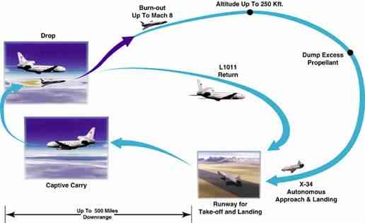 Hajtómű nélküli és hajtóműves repülési tesztek A következő lépésként az X-34-est az Orbital Sciencess Corporation szállítógépére, az L-1011 (Starglazer) rögzítve emelik magasba, a Hadsereg White Sands-i Rakétakísérleti terepén, majd választják le hordozójáról, s figyelik miként hajtja végre az előre beprogramozott automatikus leszállást. Mindeközben az Orbital befejezi a második, A-2 jelű X-34-es összeszerelését. Fastrac típusú hajtóművét. (A hajtóműről részletesen az alábbi internet címen olvasható: http://www1.msfc.nasa.gov/NEWS/background/facts/fastrac.htm) a Légierő Holloman bázisán szerelik rá, s itt végzik el a vele a földi teszteket is. Ezeket a hajtóműteszteket követően az X-34-est átszállítják a Dryden kísérleti terepre, ahol a kísérletek újabb fázisa kezdődik, ezúttal az X-34-es már saját hajtóművét is használja.